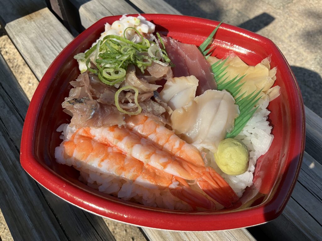海鮮丼弁当を公園でいただき