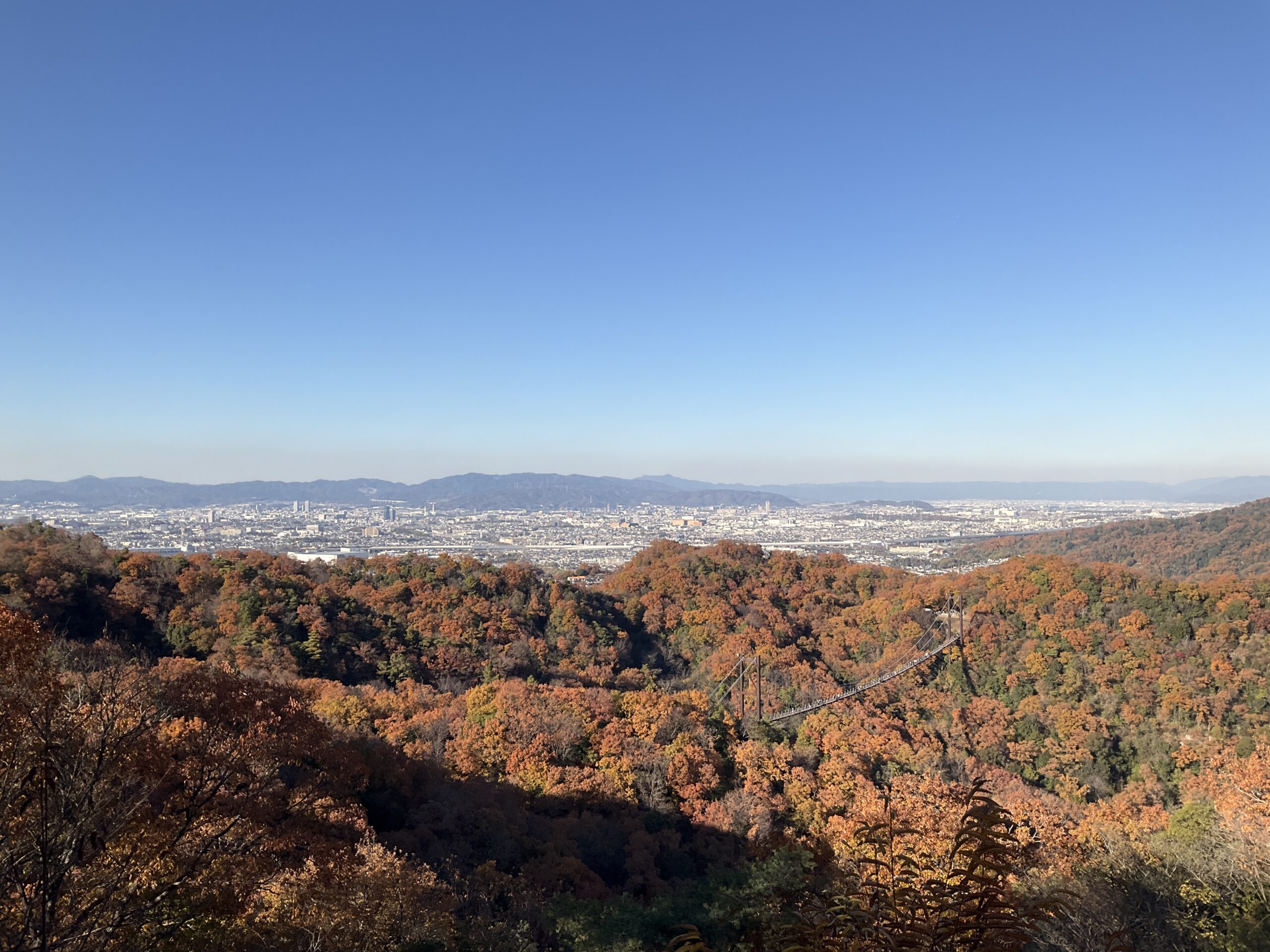 ここからは紅葉の中の吊り橋や大阪北部が眺められる