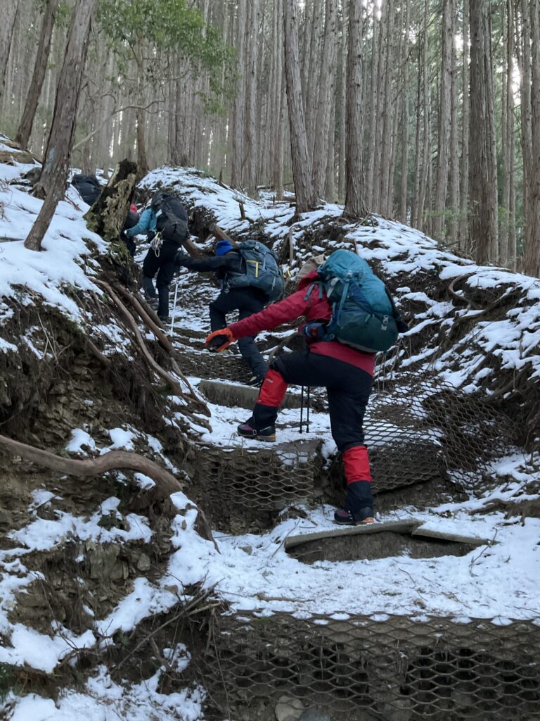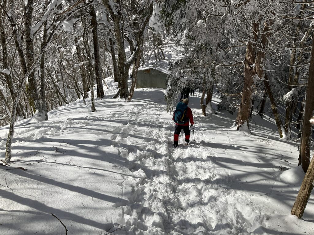 登山道の雪が厚くもろく、
