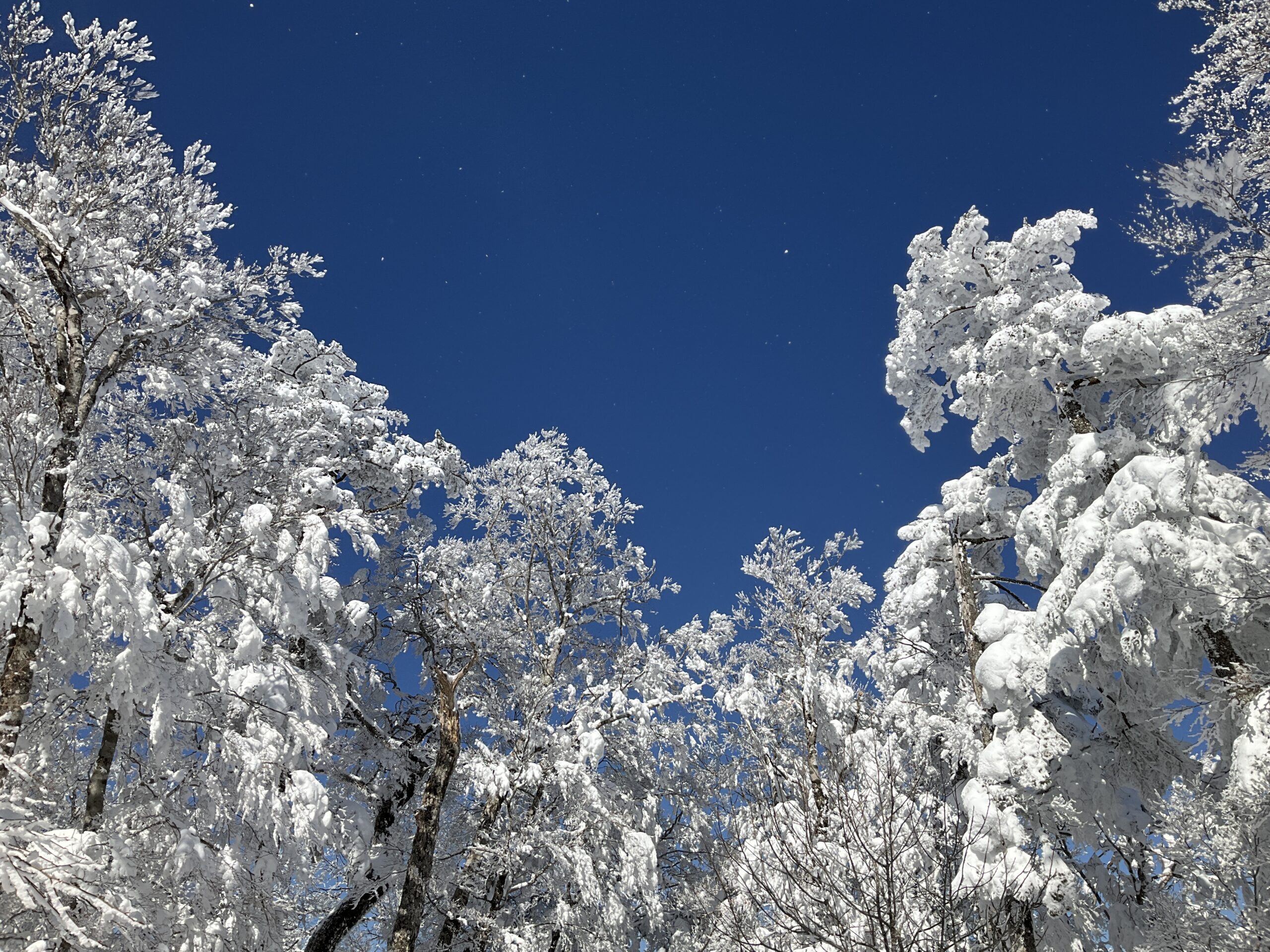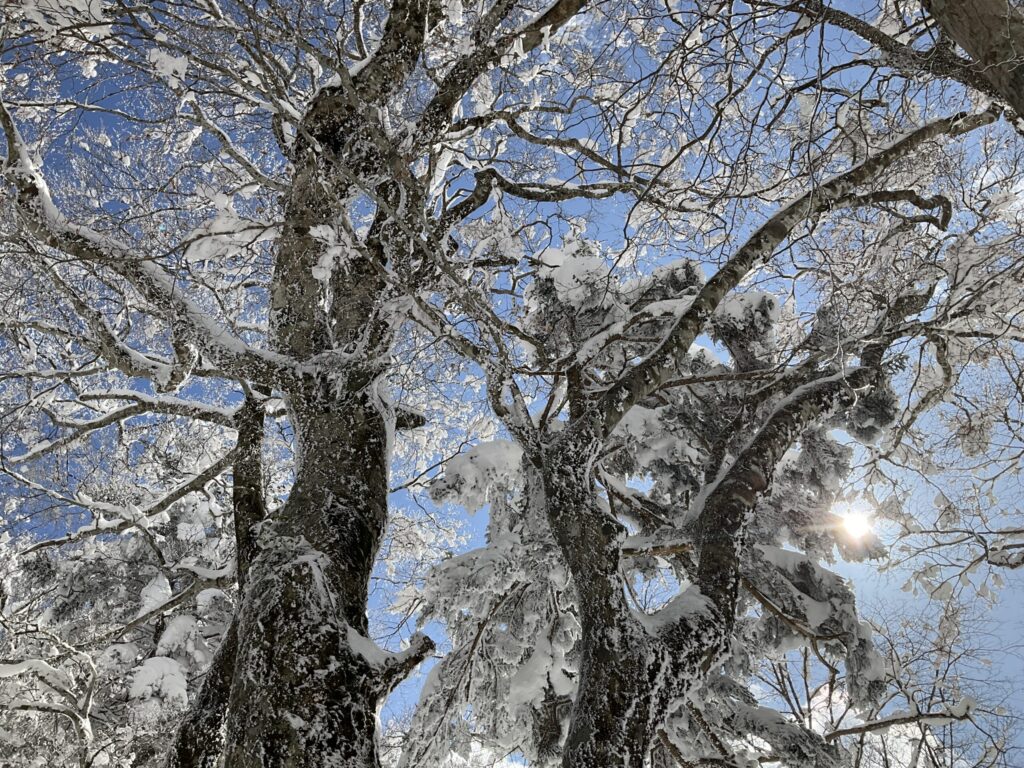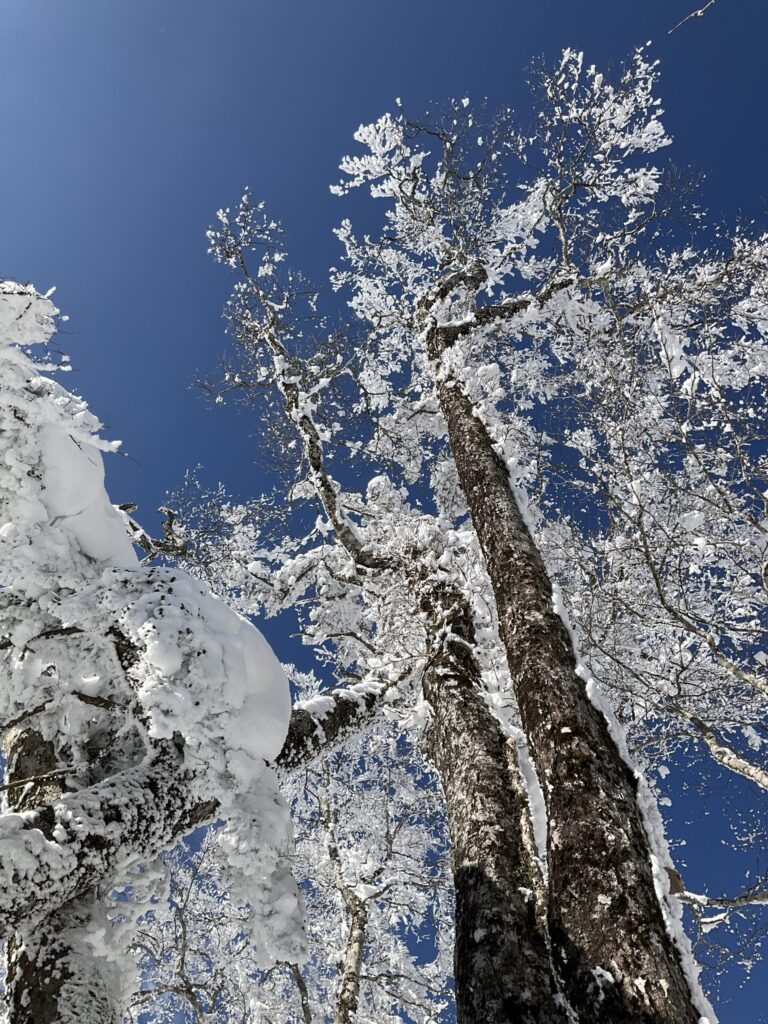 見上げると逞しい木に霧氷と雪