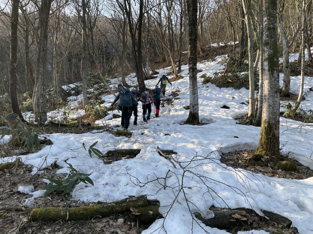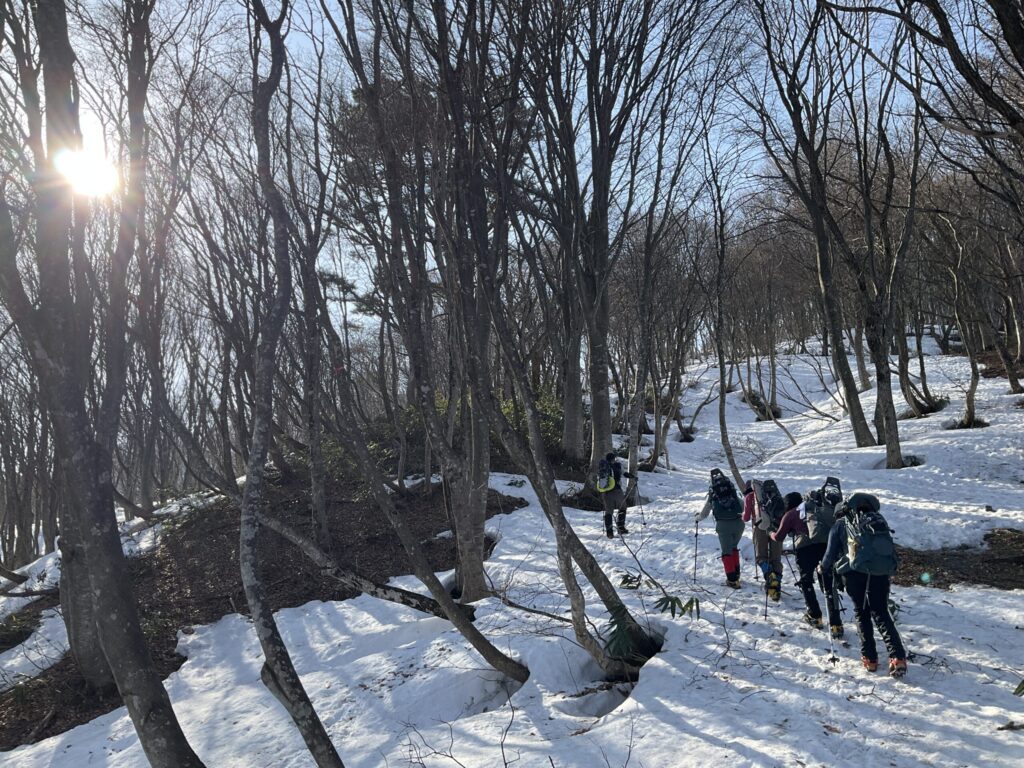 途中でメンバーがスノーシューからアイゼンに履き替え